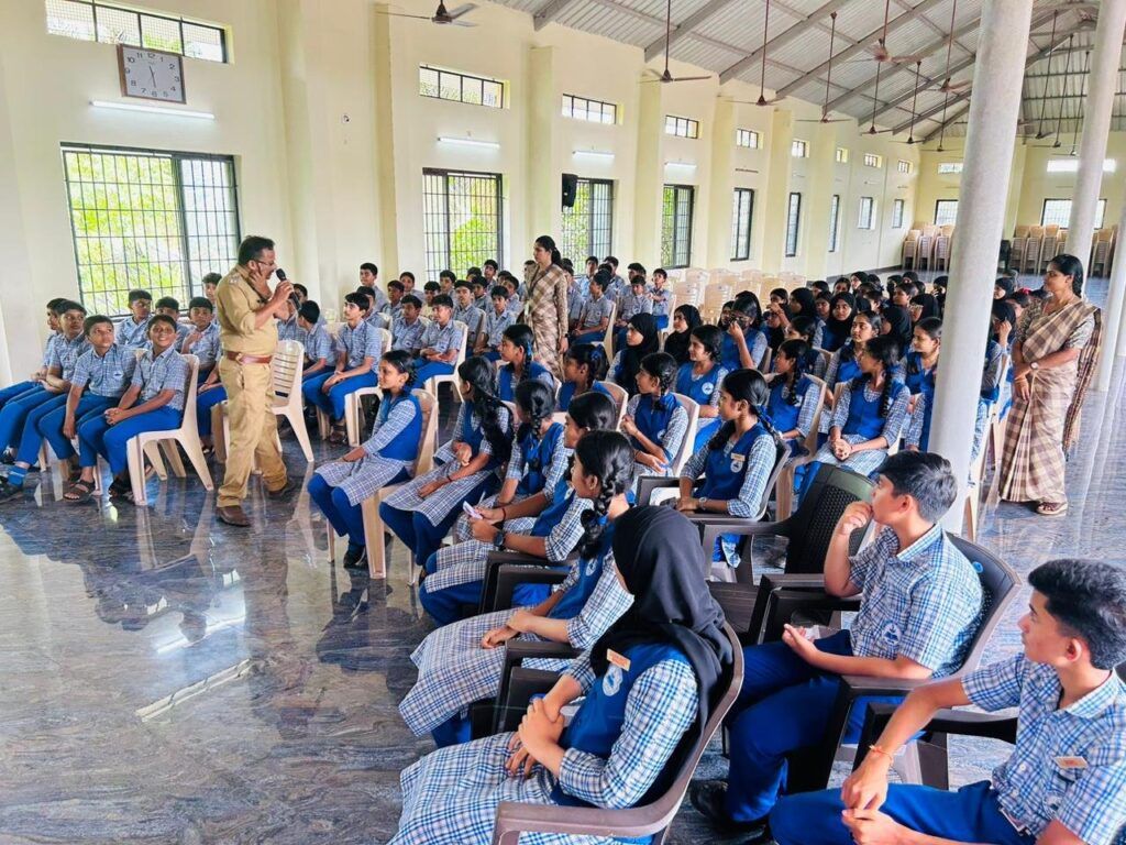 The programme commenced with a warm welcome by Fr. Sooraj Joseph Lobo, who greeted the officials from the Fire and Rescue Service. Among the distinguished guests were Rajesh C.P. (Station Officer), Vishnu S.S. (Fire and Rescue Officer), Ragith Raju (Fire and Rescue Officer/Driver), Pradeep R. Menon (Home Guard), Manager Fr. Melwyn D’Souza, Principal Ancy Mathew, school staff, and students.